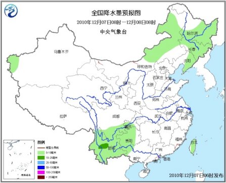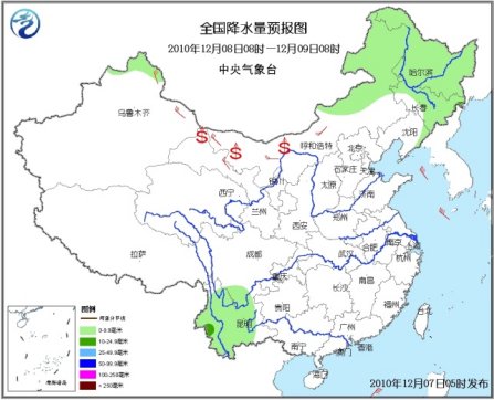 7日08時至8日08時,新疆西南部、內蒙古中東部、黑龍江中東部和南部、吉林、遼寧中東部等地的部分地區有小到中雪或雨夾雪;四川南部、重慶南部、貴州大部、云南、廣西西部及臺灣等地的部分地區有小到中雨或陣雨。內蒙古中西部、江南中東部、華南東部的部分地區有4~6級風;南疆盆地、內蒙古西部的部分地區有揚沙或浮塵。臺灣海峽、臺灣以東洋面和以南海域、南海東北部海域將有8~9級、陣風10~11級的東北風;東海南部海域、南海西北部、中部和西南部海域、北部灣將有7~8級、陣風9級的東北風。