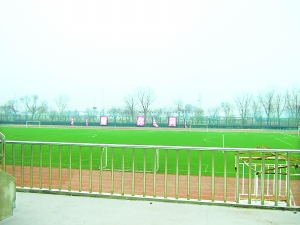 通過門向體育場內部望去,除看臺一側外,塑膠場地仍顯得非常清潔。只不過掛在鐵絲網上的標語,已被風吹落,只看得清“健……你……同”三個大字。