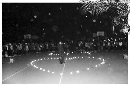 據該校大二女生蓓蓓(化名)回憶,當晚9點30分許,她正和舍友去操場健身,忽然聽到一群男生在大聲喊,好奇地過去一看,發現在一號女生宿舍前,有一二十名男生燃放煙火,向女生宿舍喊話。男生們還用酒精燈在小半個籃球場大的空地上,擺出“心”形。求愛“男主角”站在其中打電話。