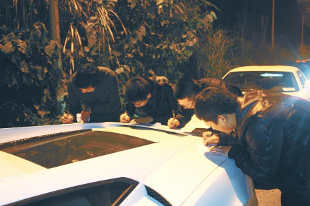 交警進(jìn)行拍照取證后,責(zé)令四名駕駛員開著跑車到大隊(duì)部作進(jìn)一步調(diào)查處理。