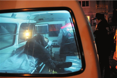 消防員從起火房屋內(nèi)救出一名男子,將其送進(jìn)急救車中。記者看到,該男子躺在車中,抱著雙臂瑟瑟發(fā)抖,不時(shí)向急救人員手持的袋子內(nèi)嘔吐。