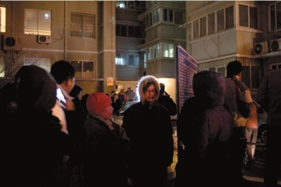 樓內(nèi)住戶被疏散后在小區(qū)里頂著寒風(fēng)等待回家