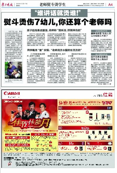 14日,興化板橋幼兒園一名幼兒老師,用電熨斗懲罰上課講話的學生,先后有7名幼兒臉部被熨斗燙傷,事后興化市召開新聞發布會介紹,肇事易老師所用的電熨斗是一只用來熨燙鞋墊的小熨斗,觸碰幼兒臉部時該老師誤以為熨斗的底板不再發熱(本報17日A4版曾專門進行報道)。新聞見報后,全國各大網站紛紛轉載,引起眾多讀者關注。昨天下午4點,興化市政府再次召開新聞發布會,會上透露,易某并罰款500元,兩名傷勢相對較重的幼兒已被送往上海治療。