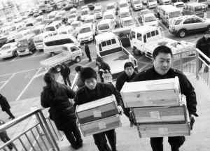 近期,治堵傳聞讓北京新車上牌數量明顯增多。圖為北京岳各莊檢測場,工作人員正在緊急調運4000副新車牌。記者 賈寧攝
