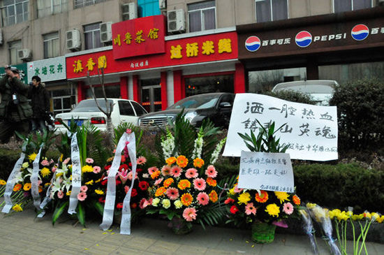 1月4日,泰安市發(fā)生了震驚全國的“1.04”持槍殺人案,2名民警和一名協(xié)勤在抓捕犯罪嫌疑人過程中壯烈犧牲。今天,泰安各界群眾自發(fā)來到案發(fā)現(xiàn)場(chǎng),悼念犧牲的公安民警和協(xié)勤人員。