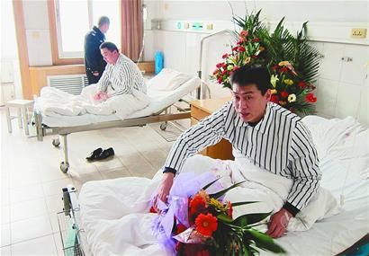 圖二:1月5日,在堵截持槍歹徒戰斗中負傷的泰安市交警支隊直屬一大隊副隊長劉峰(右)和中隊長趙偉在醫院治療。 (新華社記者 朱崢 攝)