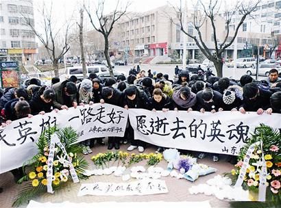 5日下午,200多名大學生和市民自發來到案發現場之一的文化路與龍潭路交叉路口,將寄托哀思的條幅放在英雄犧牲的地方,并在寒風中深深鞠躬以表哀思。現場的群眾默默地圍在一起,路過的市民也紛紛加入到哀悼的隊伍中。“一鞠躬,向烈士致敬;二鞠躬,向烈士感恩;三鞠躬,烈士一路走好……”一位大學生站在最前方,帶領現場的群眾集體為烈士三鞠躬。