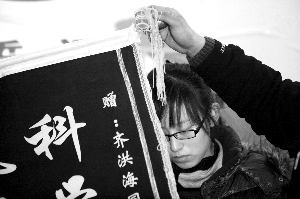 1月6日晚,泰安市交警支隊直屬二大隊,民警在展示齊洪海的生前所獲錦旗,他的女兒神情沉重。本報記者 楊杰 攝