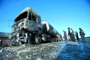 該車車身大部分已被燒壞,駕駛室只剩鐵架,車輛輪胎盡毀,僅剩鐵圈。部分油料順著馬路北側排水溝,流向50多米外的橋洞下。