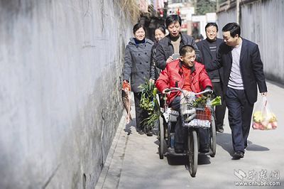 昨日上午,溫暖的陽光灑在漢口球場路的一個小巷里。一輛輪椅邊圍滿了人,大家有說有笑,場面十分溫馨(如圖)。