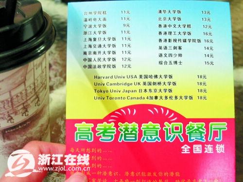 (浙江)溫嶺市日前新開出的一家“主題餐廳”,賣的不是名菜是菜名。這家餐廳所有的菜,都是以大學(xué)校名為名,炒年糕叫“臺州學(xué)院糕”,三鮮面叫“溫嶺電大面”,咖喱飯叫“清華大學(xué)飯”……