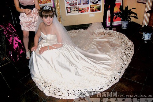 祖籍廣東的彭先生喪妻多年,近年來在北海經營一家珍珠公司。“兩年前,楊小姐答應嫁給我之后,我就開始考慮,拿什么來送給我的愛人呢?”早年從事美術設計的彭先生決定,制作一件特殊的婚紗。他提出設想后,委托香港一名設計師進行設計。
