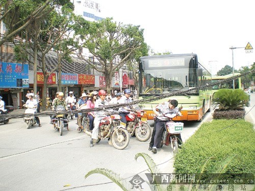 昨日(25日)下午,一輛滿載小食品的大貨車行至南寧市五一東路29號附近時,由于將橫穿馬路上空的電纜線刮落,同時導致5根水泥電線桿斷裂歪倒,車輛通行受阻。事故發生后,交警、城管等部門立即找來竹梯,將墜落的電纜線支撐起來,使過往車輛能緩慢通行。