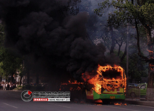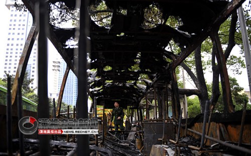 (17時30分,大火被撲滅,整個公交車已被燒成空空的鐵架子。圖/瀟湘晨報滾動新聞記者 趙尚渝)