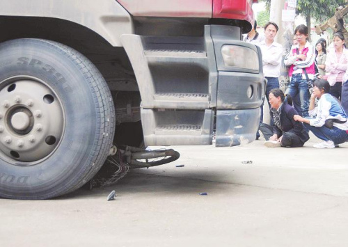 電動車被卷入卡車車輪下 本報記者宋延康攝