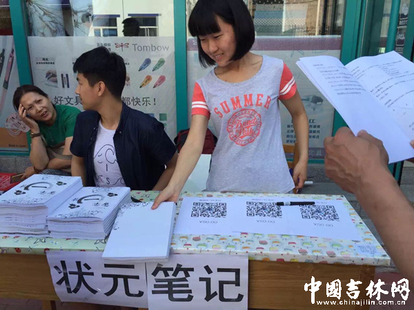 中國吉林網訊 記者 郭美佳 文/攝 中考第一日,在師大附中清華校區(qū),吉林省理科高考裸分第一名劉默涵在考場外賣起了“狀元筆記”,排版精細,誠意滿滿,50元一本,受到很多家長的追捧。