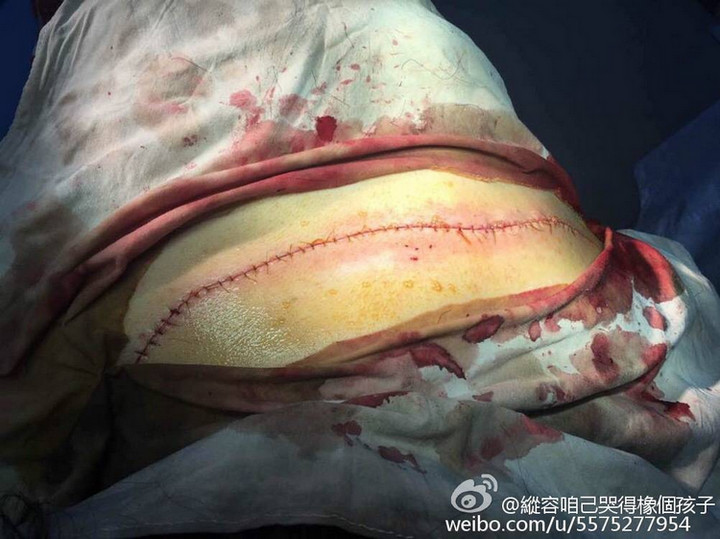 在醫(yī)院治療時,有人幫她拍下一組照片。其中一張,該年輕女子趴在手術臺,可明顯看到其后頸下方15厘米處,有一條從左手腋窩延生至右肩的傷口,醫(yī)生正對其進行手術。而另一張圖片,是其傷口縫合后情況,背部有一條如蜈蚣般的傷痕,令人觸目驚心。