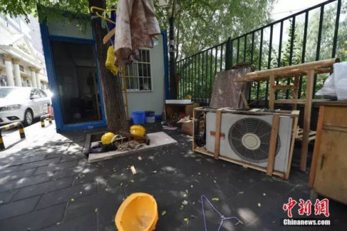 工人剛搬進(jìn)帶空調(diào)的“新家”又變了,“柜子”被要求馬上拆除。圖為“柜子”旁堆放的雜物和拆下來(lái)的空調(diào)。 金碩 攝