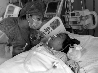劉艷軍用棉簽為昏睡中的馬淑芳沾濕嘴唇。本版圖片京華時報記者陶冉攝