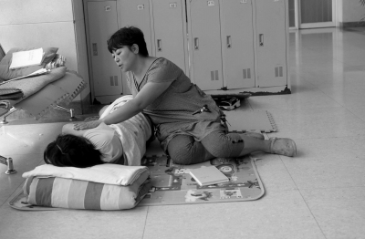 病情好轉的妞妞在醫院打地鋪。
