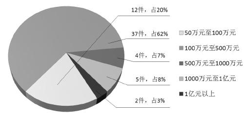“小官巨貪”案件,是指職務犯罪人員職務、級別不高(本文特指基層科級以下干部),但涉案金額在50萬元以上的案件。2012年以來,江蘇省鎮江市檢察機關查辦此類案件共60件72人,其中,2012年查辦6件7人,2013年查辦12件13人,2014年查辦13件16人,2015年查辦17件23人,2016年上半年已查辦12件13人(如圖一),呈逐年上升趨勢。在所辦案件中,涉案金額50萬元至100萬元有12件,占查辦案件總數的20%;涉案金額達100萬元至500萬元有37件,占查辦案件總數的62%;500萬元至1000萬元有4件,占查辦案件總數的7%;1000萬元至1億元有5件,占查辦案件總數的8%;1億元以上有2件,占查辦案件總數的3%(如圖二)。“小官巨貪”案件頻發,不僅危害后果嚴重,而且群眾反映強烈,嚴重影響了干群關系,亟須引起重視。