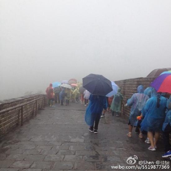 今晨,長城降雨,路面濕滑,游客打傘行走。來源@微博網友