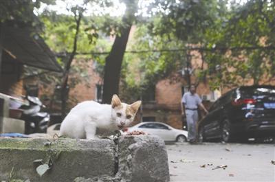 8月22日,紅瓦寺街共和村內,一只流浪貓在小區內吃食