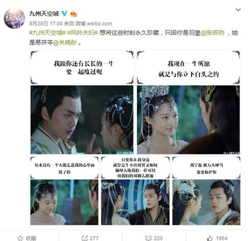 《九州天空城》則因劇中人物名稱引發爭議,有網友表示,“風天逸,易茯苓、雪飛霜聽起來好像化妝品”、“這名字太文藝了吧”。同時,劇中“你若是能笑一笑,定叫做這滿山的茶花都盡失了顏色”的臺詞也被網友吐槽“瓊瑤風”太明顯。