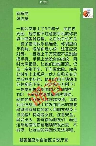 近期,微博、微信等社交平臺流傳著一個公交車上“高級騙局”的提醒,消息稱“一輛公交車上了3個騙子,坐在你周圍,趁你稍不注意把手機放你衣袋中或者背包里,之后說手機不見,騙子借同伙手機通話,你袋里的手機響,誣陷你是小偷!注意應變對策:一旦遇上千萬莫慌不急別觸摸手機,手機上就沒你的指紋,同時大聲報警,讓他們知難而退。”這則名為新騙局的消息說得有板有眼,落款為“新疆維吾爾自治區(qū)公安廳宣”,盡管沒有明確說明案發(fā)的時間、地點,但還是讓部分網(wǎng)友誤以為此類詐騙已在新疆發(fā)生,發(fā)布后被當?shù)鼐W(wǎng)民大量轉發(fā)。