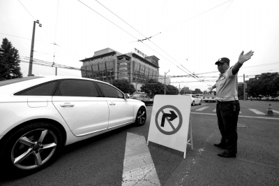 王府井街口豎起“禁右”標識。京華時報記者趙思衡攝