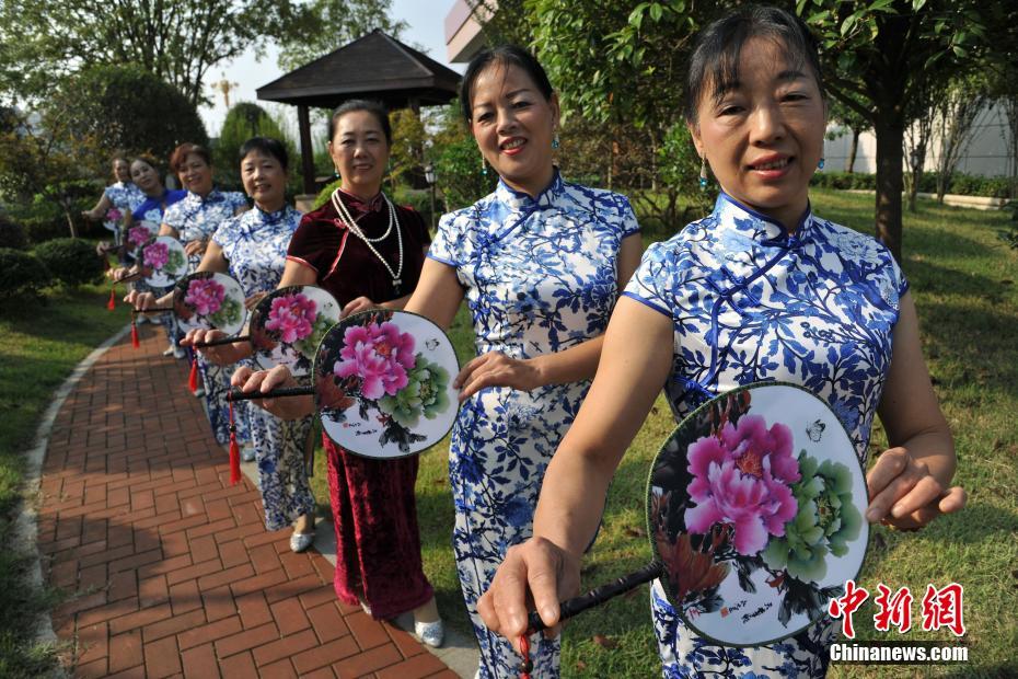 10月9日重陽節,江西省萬載縣龍湖公園內,萬載縣老年大學正舉行“旗袍秀、過重陽”活動,20多名60歲以上的老年人身著旗袍,在龍湖公園優雅“走秀”,以獨特的方式展現出她們的“夕陽美”。鄧龍華 攝