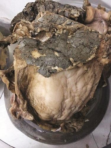 9日,記者在龐先生家里看到,那坨大的“怪物”直徑約40厘米,高約15厘米,表皮皺巴巴的,看起來像動物大腦,用手觸摸表皮,就像摸到粗糙的砂紙,“怪物”內部雪白細膩,捏在手里很有韌性,聞上去沒有明顯的氣味。
