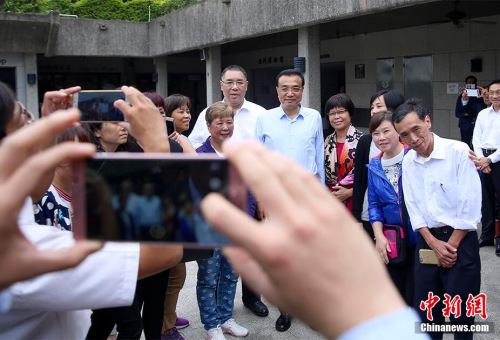 10月11日下午,國(guó)務(wù)院總理李克強(qiáng)在澳門(mén)特別行政區(qū)行政長(zhǎng)官崔世安陪同下,在澳門(mén)視察。圖為李克強(qiáng)來(lái)到澳門(mén)博物館參觀并與游客合影。 中新社記者 劉震 攝