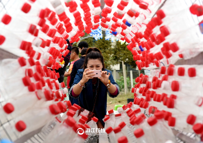 10月12日,在杭州余杭區(qū)黃湖自然體驗(yàn)園,環(huán)保志愿者們正在用撿來的近1萬只飲料瓶,搭建1個(gè)直徑2.5米,長約9米的“漂流瓶”。