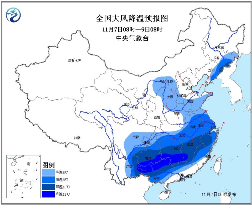 受強(qiáng)冷空氣影響,7日至9日,我國(guó)中東部地區(qū)將出現(xiàn)明顯的大風(fēng)降溫天氣。南方大部地區(qū)氣溫將下降8~10℃,其中,江南中南部、華南北部、貴州、云南東部等地的部分地區(qū)降溫幅度可達(dá)10~12℃,局地12℃以上;東北地區(qū)東南部、華北西部和南部、黃淮東部等地的部分地區(qū)氣溫將下降6~8℃,局地降溫幅度可達(dá)10℃以上。上述大部地區(qū)將有4~6級(jí)風(fēng),陣風(fēng)7級(jí)。我國(guó)東部和南部海區(qū)先后將有7~8級(jí)、陣風(fēng)9~10級(jí)偏北風(fēng)。