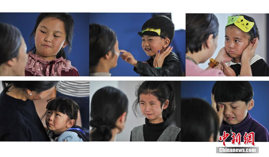 11月6日,昆明一教育機構策劃了一場親子“試驗”,8組家庭的母親化妝成20年后的模樣,其孩子蒙上眼罩后來到母親身前,再摘掉眼罩與母親對視。據該活動策劃者萬銳介紹,策劃該活動的目的在于拉近現代社會孩子與父母之間的親子關系,希望孩子能感受到養育的不易和珍惜親情。圖為孩子們看到母親“老去”的模樣后表情各異,真情流露。(拼版圖片) 中新社記者 任東 攝