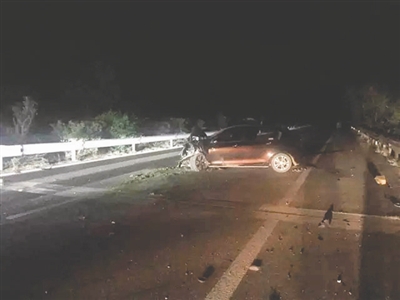 事故現(xiàn)場(chǎng),一輛小轎車橫停在車道上