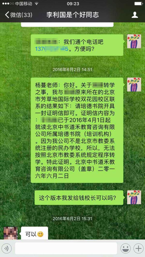 12月27日晚,錢志龍向澎湃新聞出示當(dāng)時負(fù)責(zé)招生的教師和李利國的微信聊天記錄:“負(fù)責(zé)招生的老師說‘因為我公司不是北京市教委系統(tǒng)注冊的民辦學(xué)校,所以,無法按照北京市教師系統(tǒng)規(guī)定程序轉(zhuǎn)學(xué)。’李利國回復(fù):‘可以’。”