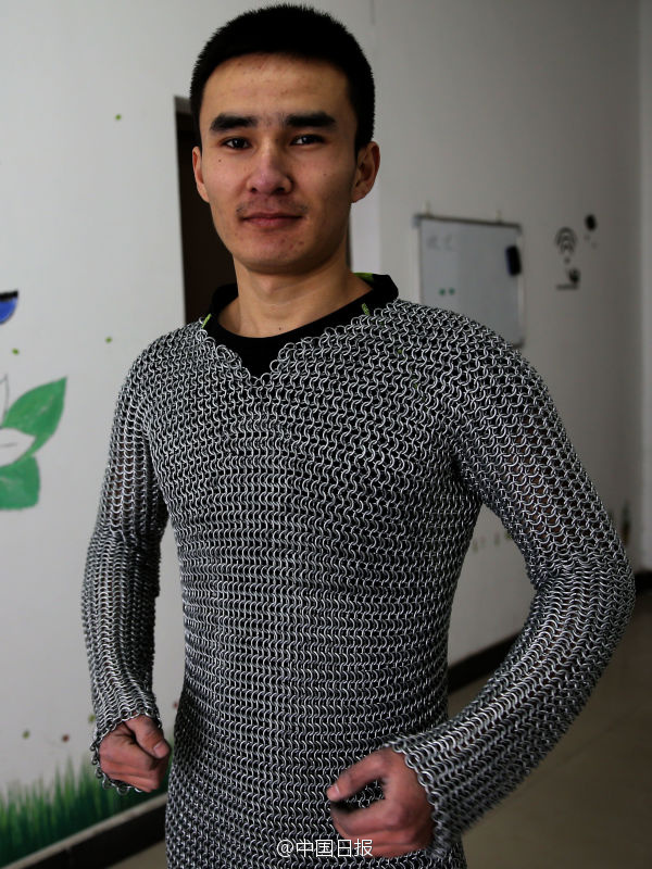 西安電子科技大學(xué)的哈斯木花一個(gè)月的時(shí)間用12000個(gè)小鐵圈手工制出一件重約20公斤的“鎖子甲”。