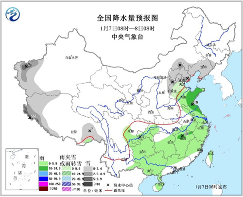 7日08時至8日08時,華北中東部、東北地區南部、新疆南疆西部、西藏西部和東南部等地有小到中雪或雨夾雪,其中西藏西南部的部分地區有大到暴雪,局地大暴雪;黃淮東部、江淮東部、江南、華南北部、西南地區東部等地有小到中雨。東海東北部將有6~7級、陣風8級的風。