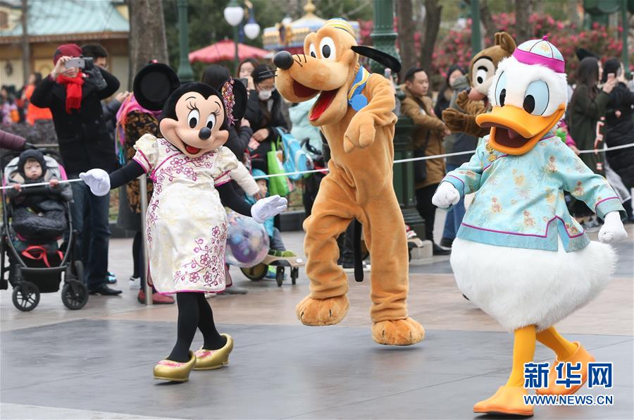 1月11日,迪士尼卡通人物在巡游表演中載歌載舞。臨近春節(jié),上海迪士尼園區(qū)內(nèi)洋溢著濃濃的“年味兒”。 新華社記者 丁汀 攝