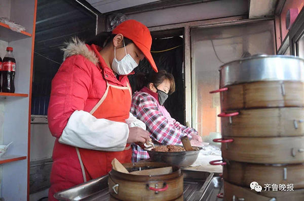 1月14日一大早,記者在無棣縣城找到了正忙著包小籠包的“用盡一生”。她本名趙平,無棣縣信陽鎮(zhèn)人,30歲,慈眉善目,笑起來有一種特別的吸引力。趙平的包子鋪其實就是一座簡易板房,而負責打掃這條街的70歲環(huán)衛(wèi)工程延新,休息之余喜歡來這里坐坐,喝點熱水,洗洗手,聊聊天。
