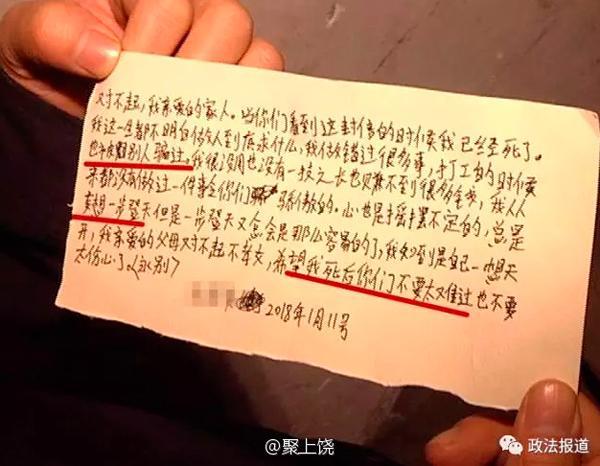 澎湃新聞看到,該紙條落款時間為2017年1月11日,當事人稱這一生都不明白做人到底是求什么,沒有一技之長也沒有賺到錢,自己沒用,打工時被騙,也沒有做過一件讓父母驕傲的事,總妄想一步登天。紙條內容還稱,自己死后,希望父母不要太難過。不過,該紙條內容是否系死者本人生前所寫,目前尚未得到警方證實。