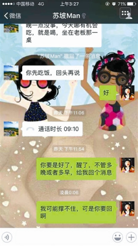 23時54分,琪琪在微信里留言:“你要是好了,醒了,不管多晚或者多早,給我回個消息。”16日零點零6分,琪琪睡覺前留言“我可能撐不住,可是你要回啊”。