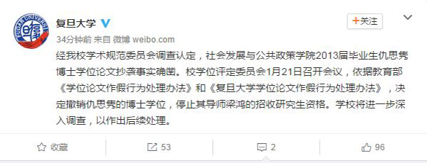 1月17日21時50分許,復旦大學官方微博就“抄襲門”發布回應:“關于媒體報道的我校社會發展與公共政策學院畢業生仇思雋涉嫌博士論文抄襲一事,我校學術規范委員會此前已接到相關舉報并啟動了調查程序。目前,相關調查正在進行中。如抄襲情況認定屬實,學校將依據《復旦大學學術規范實施條例》作出嚴肅處理!