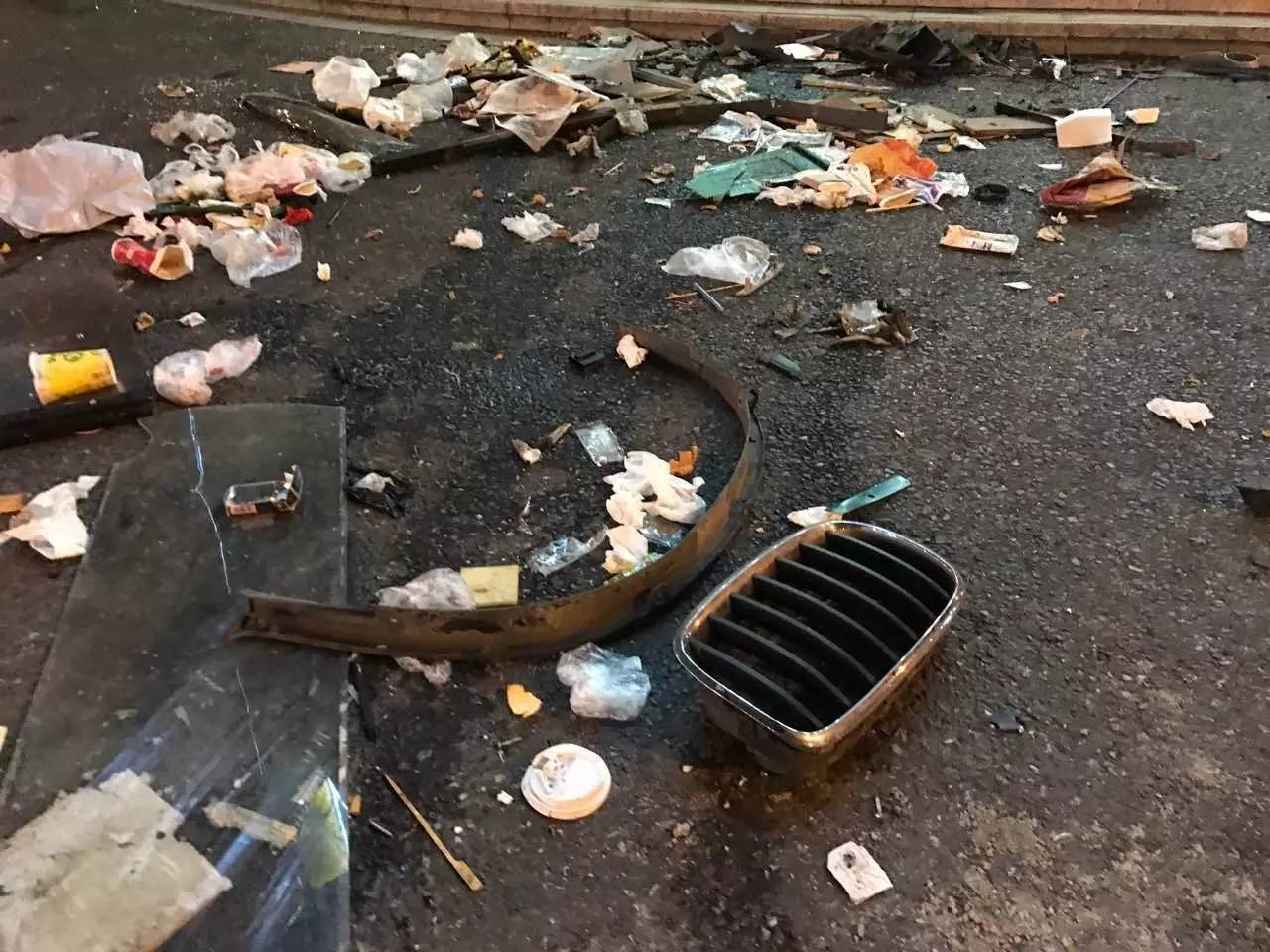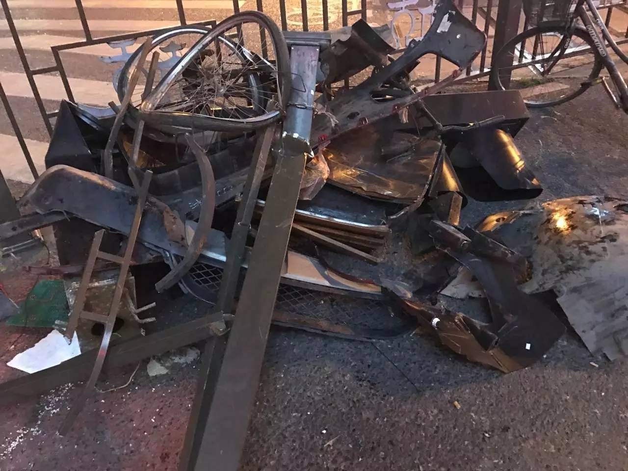 錢江晚報記者趕到現(xiàn)場時,受損車輛均已經(jīng)被拉走,但是現(xiàn)場狼藉慘狀,依然能感受當(dāng)時撞擊有多厲害。在現(xiàn)場,靠近中山北路和文暉路交叉口西南側(cè)一角,堆放著還沒處理的碎片,里面有變形的自行車,被撞斷的護欄鐵柱,車子上的各種配件。