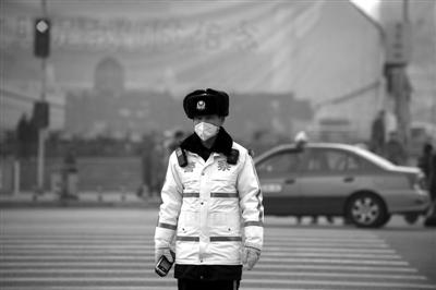 北京永外大街,在霧霾天里執(zhí)勤的交警。本報記者 王偉偉 攝