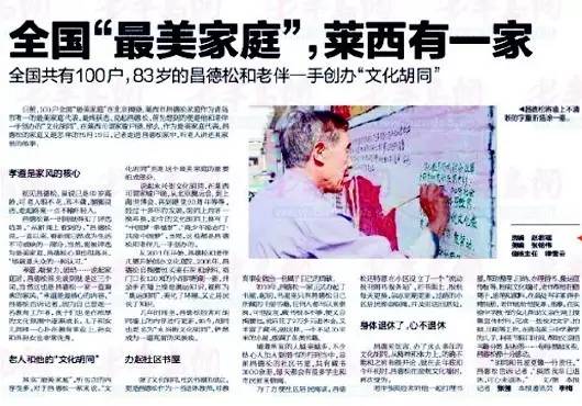 昌德松是青島市萊西市院上鎮中學退休教師,2001年起,他和老伴兒開始創辦文化庭院,積極營造家庭文化氛圍,在粉刷后的墻上書寫古今詩詞、格言名句、繪制壁畫等。2008年奧運會期間,昌德松自掏腰包買來石灰和涂料,將門口長120米的小胡同粉刷一新,并親手在墻上描繪奧運知識,被鄰里街坊稱為“奧運胡同”,慕名來參觀的人絡繹不絕。如今,這條文化胡同仍是萊西當地一道美麗的風景線。