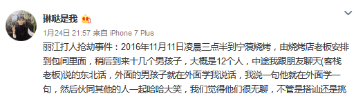麗江打人搶劫事件:2016年11月11日凌晨三點半到寧蒗燒烤,由燒烤店老板安排到包間里面,稍后到來十幾個男孩子,大概是12個人,中途我跟朋友聊天(客棧老板)說的東北話,外面的男孩子就在外面學(xué)我說話,我說一句他就在外面學(xué)一句,然后伙同其他的人一起哈哈大笑,我們覺得他們很無聊,不管是搭訕還是挑釁的意思,我們沒有理會,繼續(xù)吃烤聊天,隔一會對方又開始學(xué)我們說話,這一次學(xué)完我們說話還辱罵我們,之后我們就問他什么意思,是不是喝多了酒,起初他們還沒有回復(fù),之后我們就各自吃烤肉了,其中有個穿藍色馬甲的中年男人,到我們我們間的門口打量我們包間,我們就不知道什么意思,我們還是繼續(xù)吃烤肉,之后他們就拿起酒瓶子進我們的包間,把酒瓶子砸到我們頭上,我們當時就是暈的,之后我就被那三四個男人拉著頭發(fā)給拖到燒烤店的門口外面,一頓暴打,一邊錄視頻一邊打,之后覺得錄視頻的效果不好,又扯著我的頭發(fā)面朝天的樣子,繼續(xù)錄視頻暴打我,一邊打一邊還說:你不是東北人嚒?你不是很牛逼嗎?然后就哈哈大笑,把我打得滿臉都是血,還在拿碎掉的酒瓶子劃我的臉,之后他們?nèi)コ闊熜菹⒘耍谖伊餮倪^程,他們要求我按照他們說的話去說,不然就把我拖到山上去給埋了,威脅我的內(nèi)容是:小妹妹,你是不是自己從樓上掉下來摔成這樣的啊?要不要哥哥們幫你打120啊?要不要哥哥們救你啊?我們看你好可憐啊。我學(xué)著他們的話去說,這個過程他們是全程錄視頻的,反偵察的能力很強,說完之后就繼續(xù)打我,又了打了一頓,最后這次打完我,臨走之前有個狠狠地踢我一腳。我直接噴血了。這一腳我直接不行啦,上不來氣了,他們走之前丟給我手機,讓我自己打120 ,這是看我不行了,快死掉了,走的時候拿走我們身上帶的錢,錢包和手機,三個被打得人,只留了我這一部手機,還是看我不行了,給我打電話自救的,我們?nèi)齻人被足足打了半個小時,他們臨走之前還揚言說:他們就是當?shù)厝恕⒉慌戮臁㈦S便告、還說在麗江在看到我、讓我有去無回....120是早上6:30左右來的,這期間我一直在流血,我打120的時候,我不知道燒烤店的名字,我問燒烤店的老板,他說完以后我就昏迷了,我們在這個燒烤店被打這么久,燒烤店的老板沒有報警和打120,就眼睜睜的看著我們被打,后來警方得知這個燒烤店和那其中的一個人是認識的,他們走的時候開著一輛白色的轎車走的。