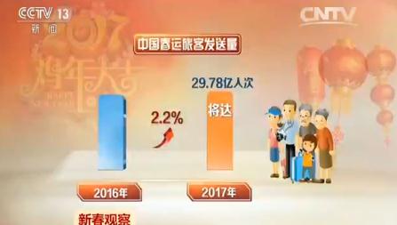 中國雞年春節七天假期,帶動的是40天的大遷徙。國家發改委、交通運輸部等部門預測,2017年中國春運旅客發送量將達29.78億人次,同比增長2.2%。其中,道路25.2億人次,增長1%;鐵路3.56億人次,增長9.7%;民航5830萬人次,增長10%;水運4350萬人次,增長2%,近十年春運交通數據幾乎年年創新高,說明春運規模在逐年擴大。